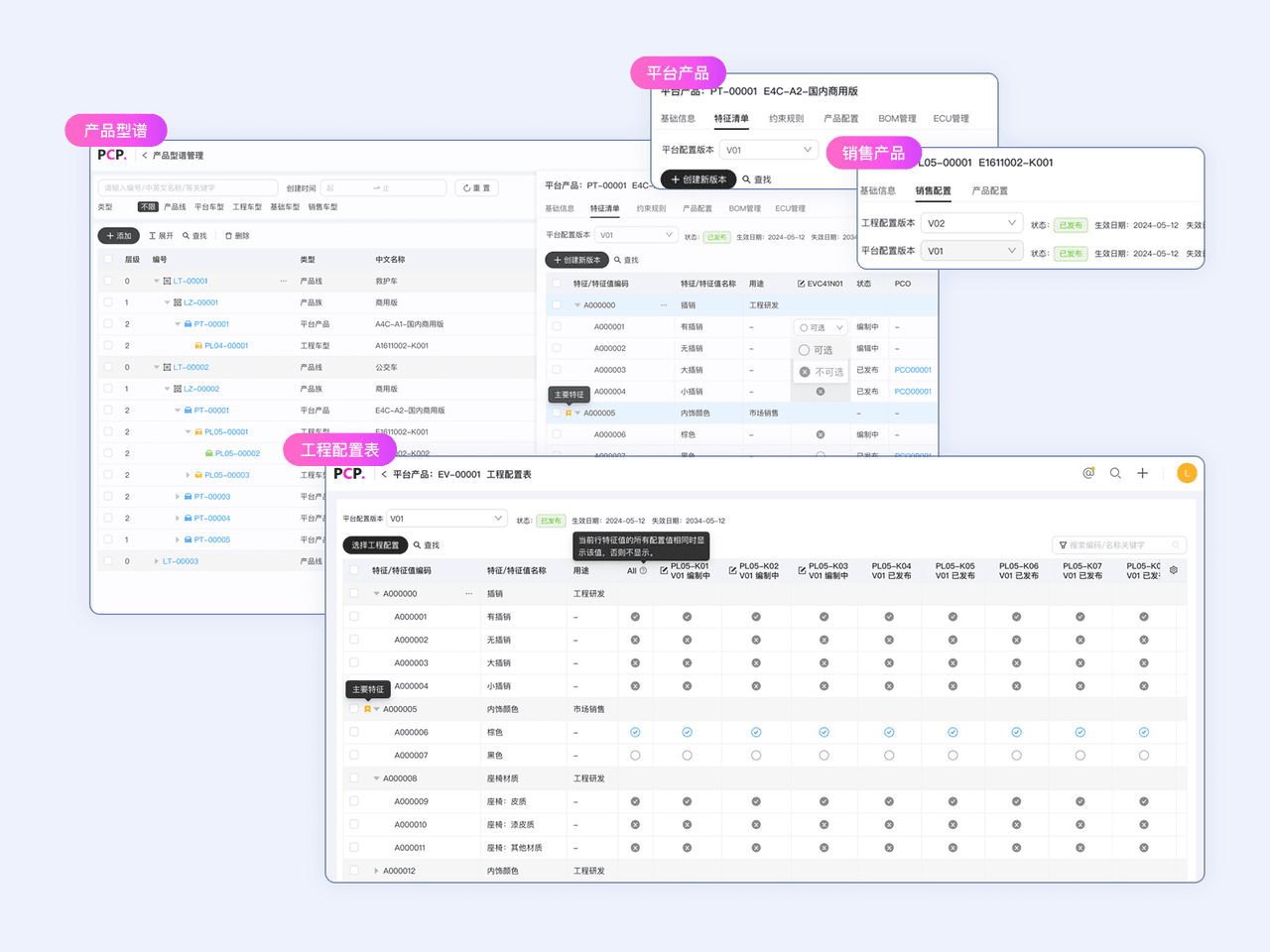 同时,PCP支持企业级的产品配置特征、技术特征等各类特征数据的专业化管理,支持特征选项与变量的维护,并可定义特征选项间的约束规则与依赖关系,助力产品基于特征及配置数据实现高效配置与管理。
