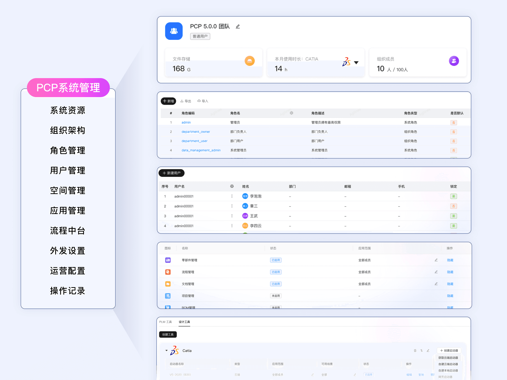 2、支撑数据对象与应用工具的权限精细分配:通过预置的角色管理与权限矩阵,管理员无需开发即可灵活配置不同角色,如:设计工程师、项目经理、专家,对PLM工具、研发项目、产品数据的访问权限。确保了PCP产品开箱即用的同时,还能快速适应各类企业的权责体系。