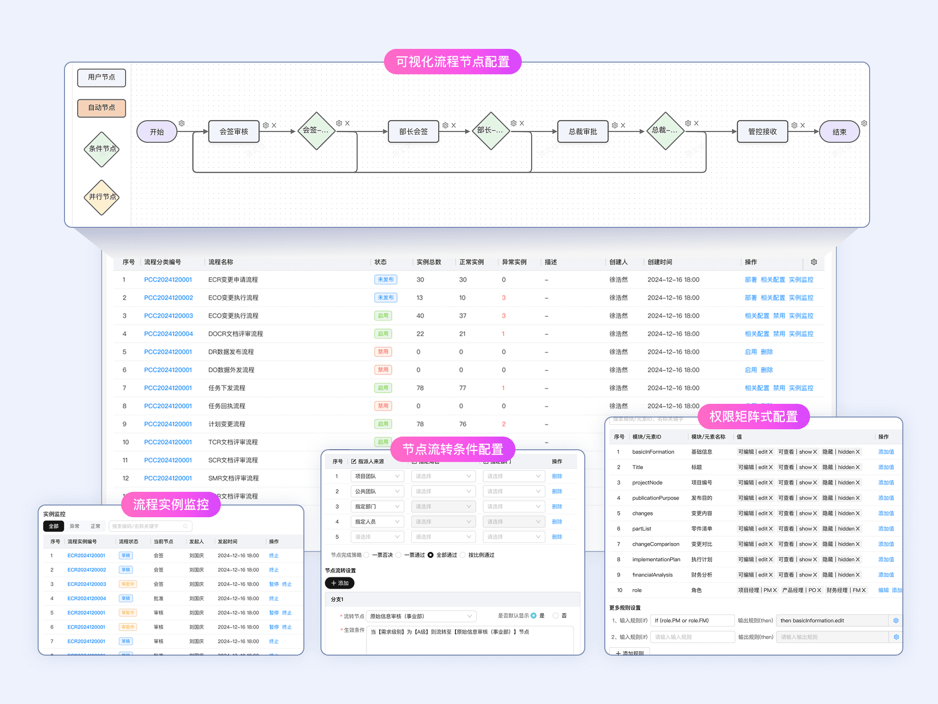2、一站式配置,简单高效:提供从流程定义、节点设计、表单联动、数据校验的全链路可视化配置工具,极大降低技术门槛,赋能实施人员根据业务需求自主、快速地搭建与调整复杂审批流程,提升部署效率。