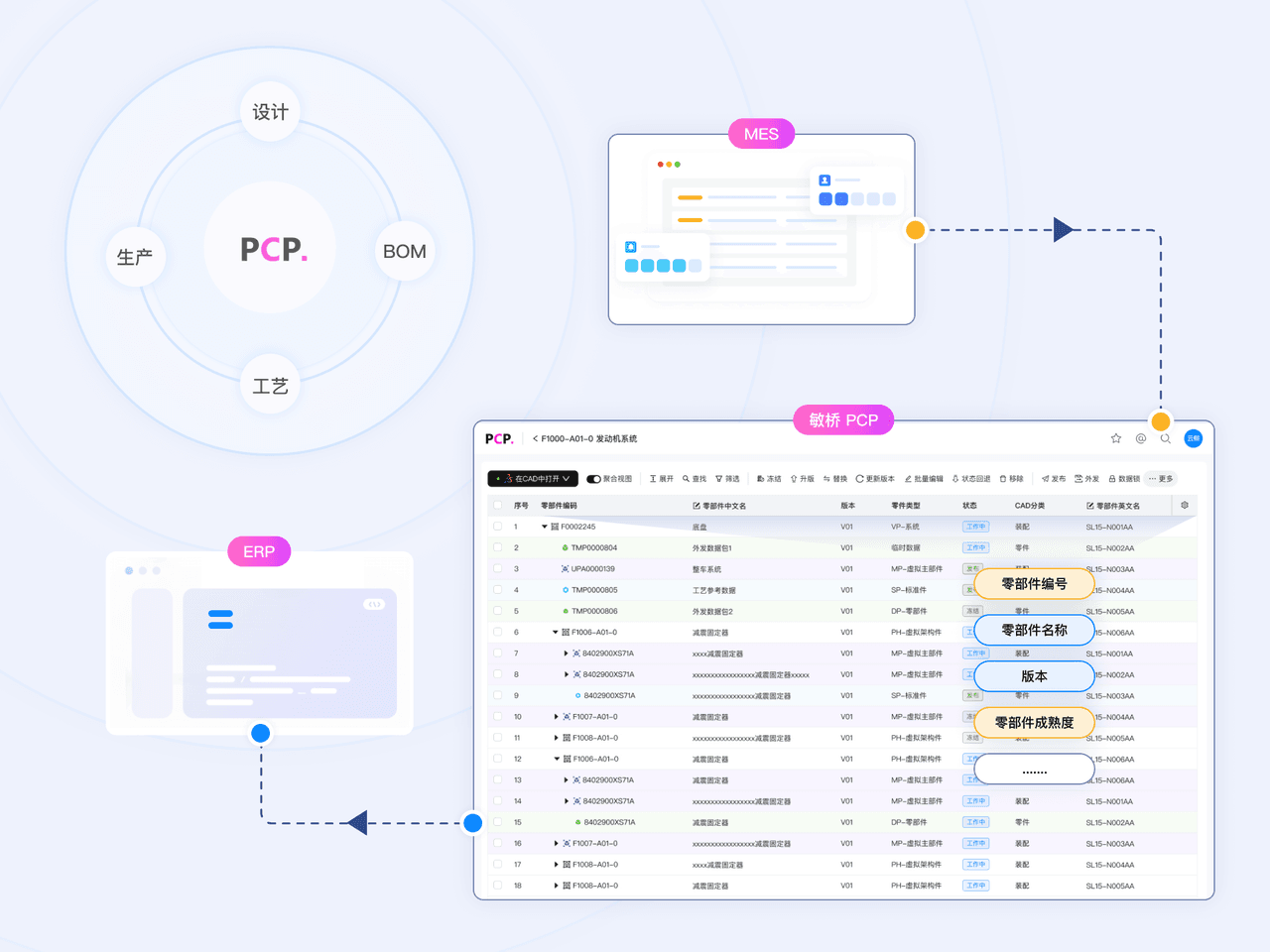 借助PCP底座的开发平台与XBOM工具,PCP的一体化数据可轻松传递至ERP、MES系统,打通研发与制造的数据链,支撑起“设计-BOM-工艺-生产”的高效业务闭环,显著缩短从研发到市场的周期,全面提升企业响应速度与竞争力。