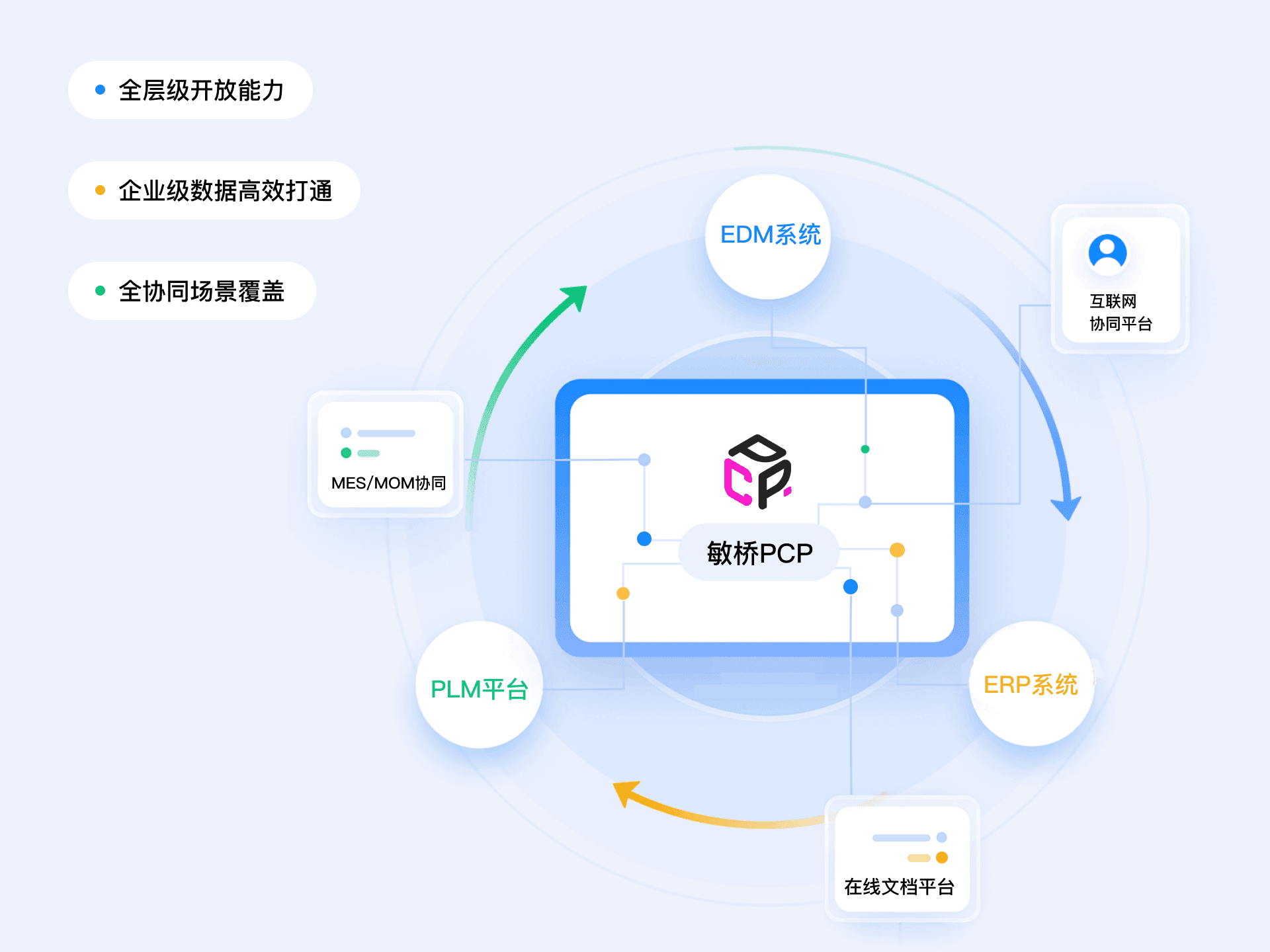 PCP开放平台,以标准API与数据集成工具双核驱动,实现安全可靠的系统集成方案,支持无缝对接上下游相关的业务系统,以全模态一体化产品数据链为主线,实现从PCP支持的研发业务场景,打通到ERP/MES/OA等平台的跨部门、跨组织工程协同场景,确保产品数据的企业级可用,实时,准确,可追溯,实现业务闭环。